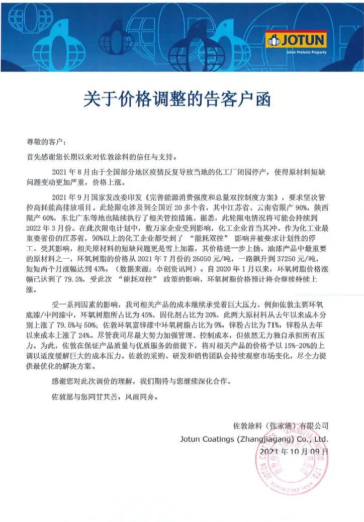 受一系列因素的影響,我司相關(guān)產(chǎn)品的成本繼續(xù)承受著巨大壓力。例如佐敦主要環(huán)氧底漆/中間漆中,環(huán)氧樹脂所占比為45%,固化劑占比為20%,此兩大原材料從去年以來成本分別上漲了79.5%與50%;佐敦環(huán)氧富鋅漆中環(huán)氧樹脂占比為9%,鋅粉占比為71%,鋅粉從去年以來成本上漲了24%。盡管我司盡最大努力加強(qiáng)管理、控制成本,但依然無力獨(dú)自承擔(dān)所有壓力。為此,佐敦在保證產(chǎn)品質(zhì)量與優(yōu)質(zhì)服務(wù)的前提下,將對相關(guān)產(chǎn)品的價格予以15%-20%的上調(diào)以適度緩解巨大的成本壓力。佐敦的采購、研發(fā)和銷售團(tuán)隊(duì)會持續(xù)觀察市場變化,盡全力提供最優(yōu)化的解決方案。